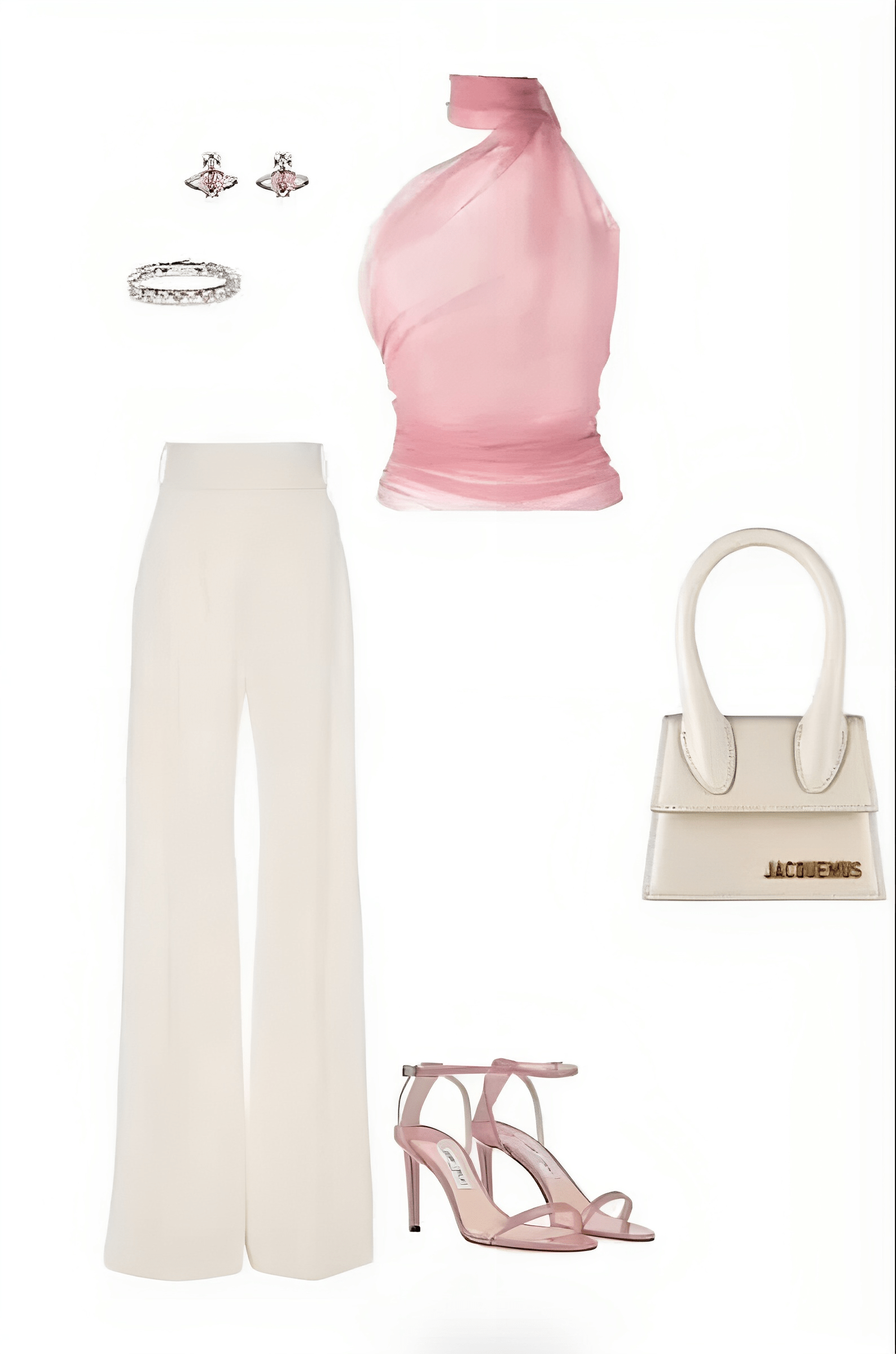 I’m totally obsessed with this light floral pink top. And paired with some off-white pants? So chic and sophisticated. The accessories are just soooo cute. Everything about this outfit is giving a chic, sophisticated vibe. It’s perfect for a summer night out with your bestie or your boo. Oh, and have I mentioned how much I love small handbags? They’re just so much more graceful and can fit all the essentials you need, like your patience, a gloss, credit cards, and of course, some mints!