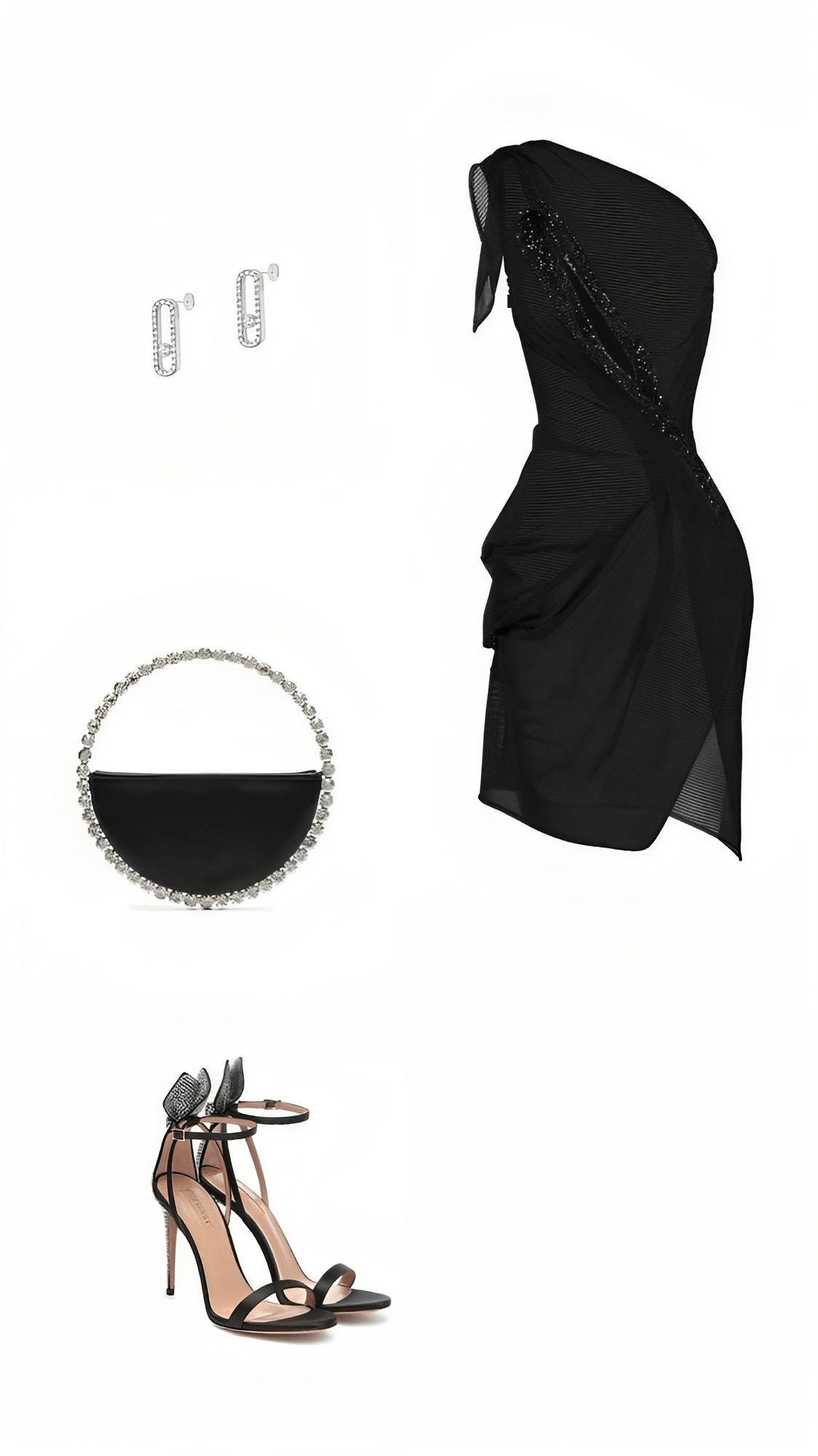 Don’t you just love this outfit? I know some people might say it’s a bit too much for a date night, but why settle for just okay? This gorgeous emerald green dress screams sophistication, and the fancy details at the bottom make it even more intriguing. And those long, dazzling earrings? They go perfectly with the dress and make the whole look pop.
