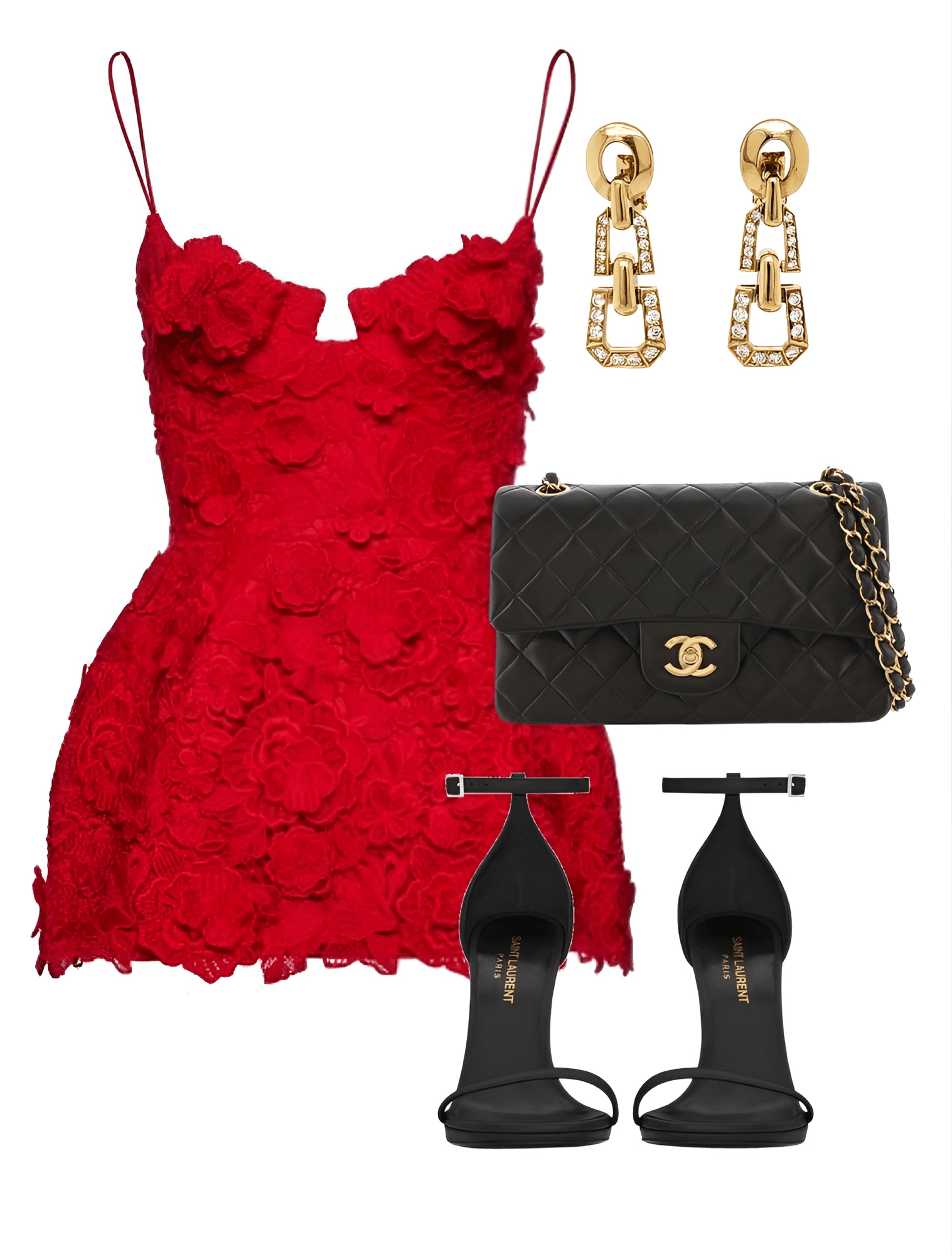 OMG, have you seen this dress? It exudes boldness, confidence, and sexiness all rolled into one. I can’t even! It’s perfect for when you want to feel like a total boss babe but also have some fun. I’m talking date night in Spain vibes, baby! And the jewelry? So soft and pretty, it really complements the red. And that vintage gold watch? It’s to die for! But let’s talk about those Jimmy Choo bow heels; they’re so adorable, I can’t even handle it! I’m seriously considering adding them to my shoe collection. They’re just too cute to resist!