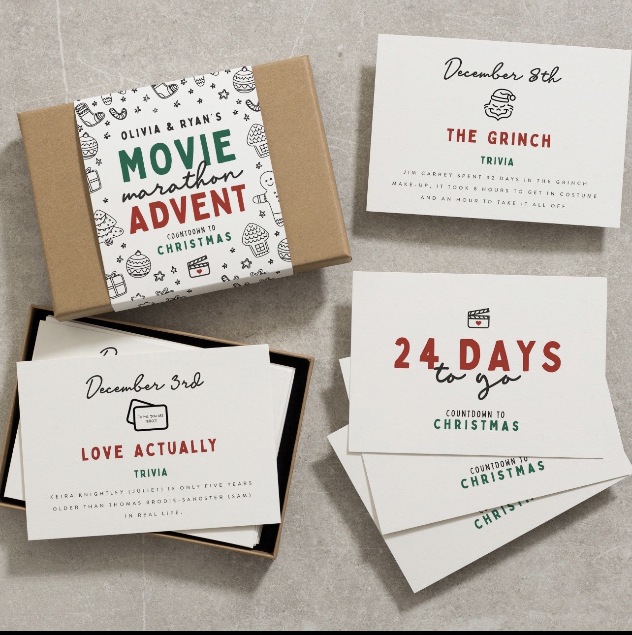 A unique way to countdown to Christmas. Each box of our luxury advent calendar contains 24 Christmas films to watch and some interesting trivia on each movie. A lovely gift for him or her, the family or any movie fan!